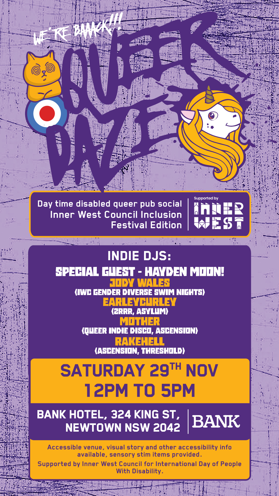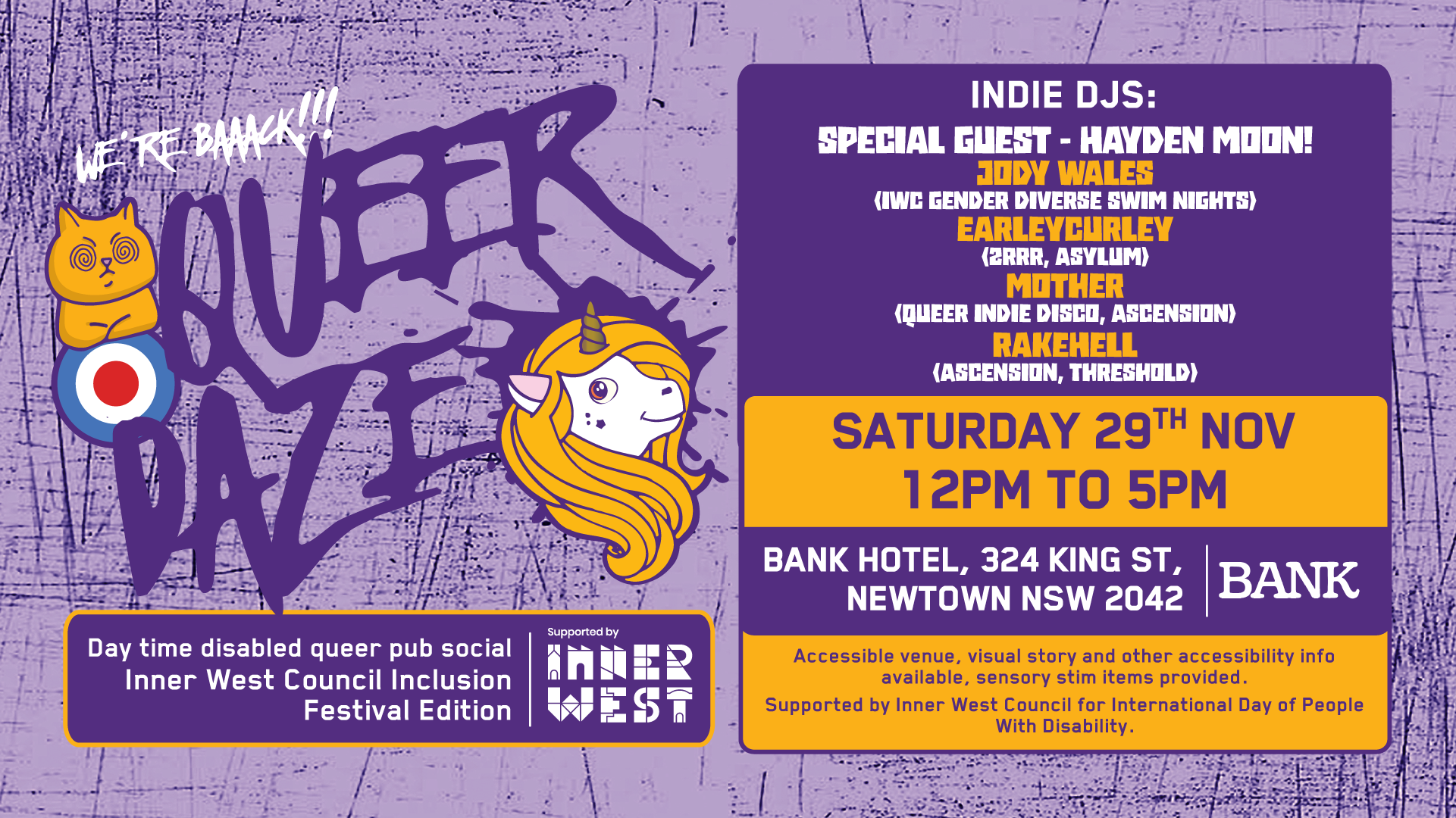 Queer Daze will have DJs playing indie/alternative/ rock music. The music will be kept at speaking level as much as possible, so you can talk to your companions easily.