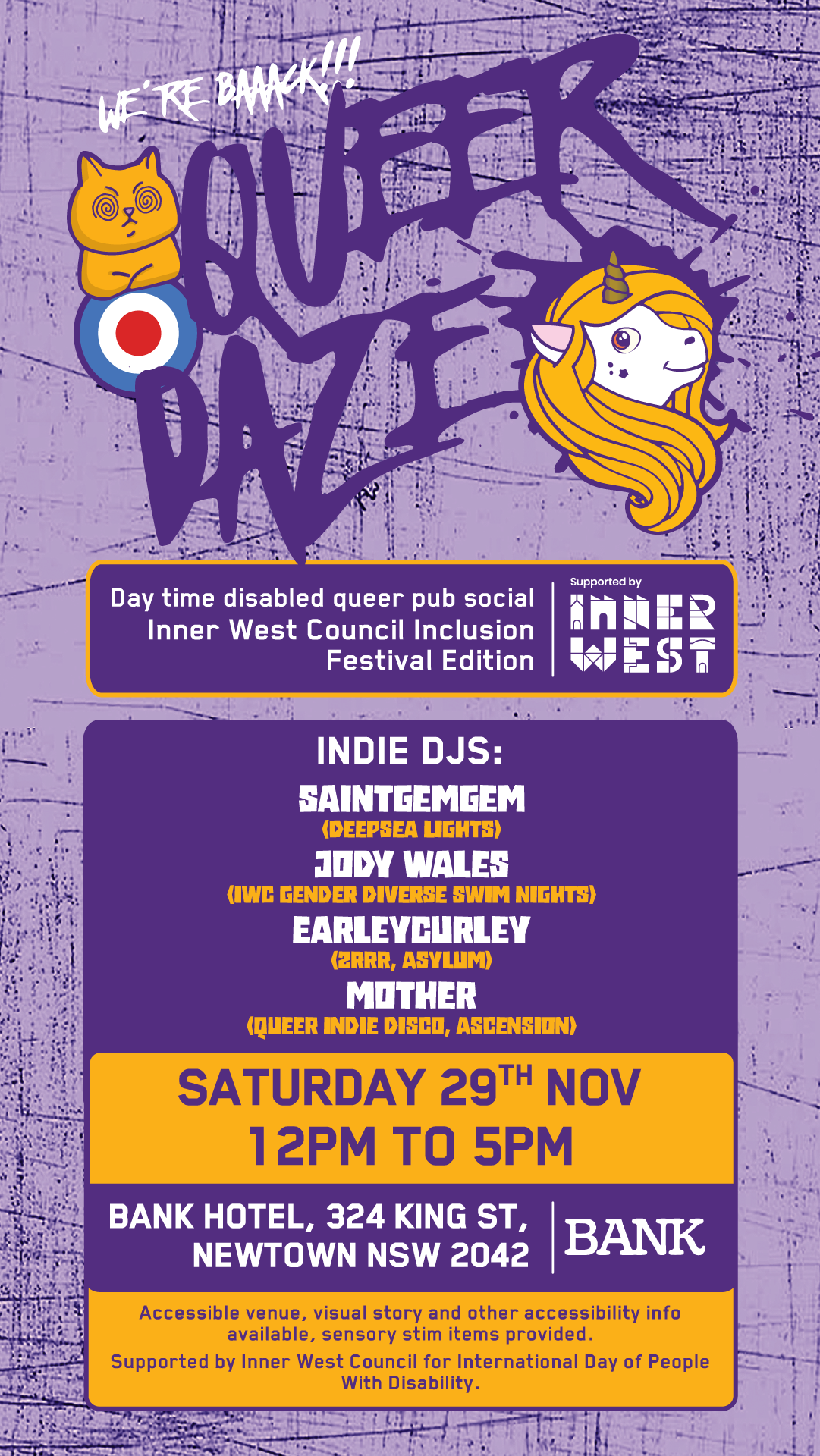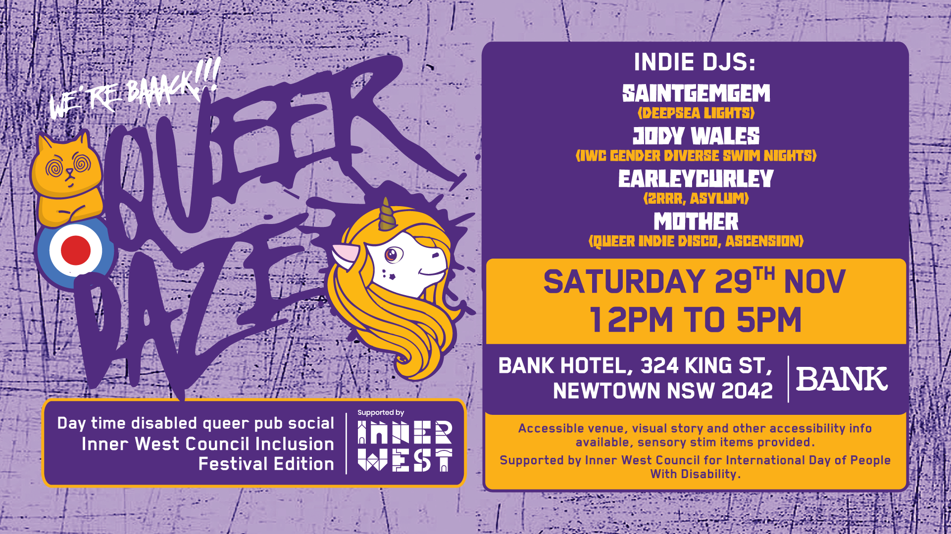 Join us for Queer Daze at The Bank Hotel this November, a disability-led, accessibility-focused daytime social, supported by Inner West Council as part of Inclusion Festival for International Day of People With Disability.
