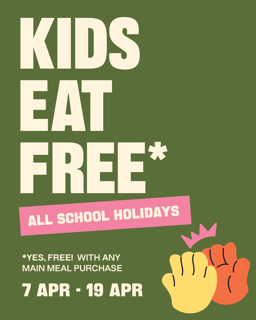 Kids eat free - all school holidays! Yes, you heard right! Kids eat absolutely free with any adult main meal purchase. Whether it's a midweek day out or a weekend adventure, bring the little ones along and let us take care of the rest.